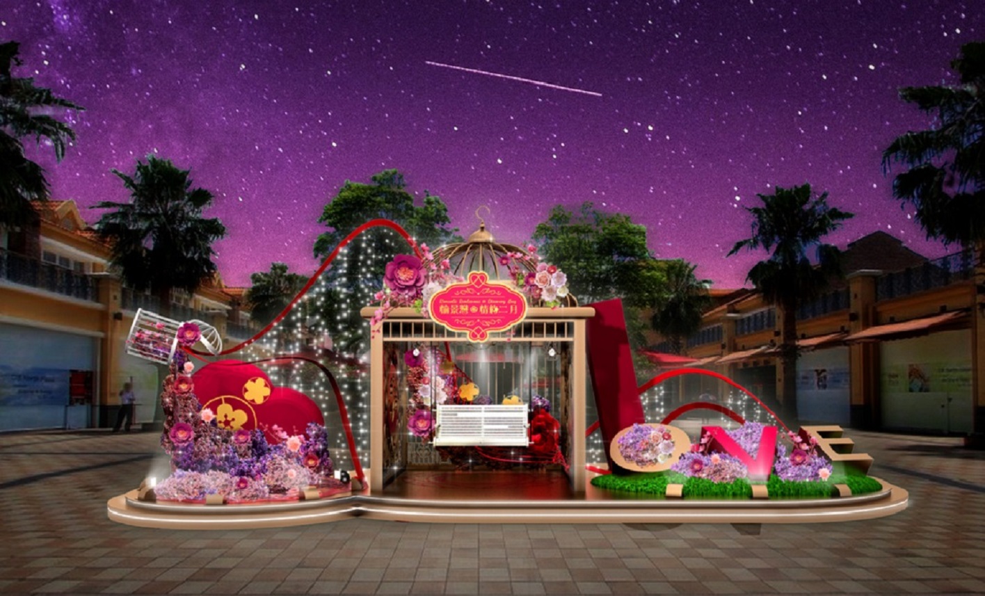 The 4-metre high "Lovebirds Paradise" features an open birdcage amid spacious gardens, overflowing with stunning pink peach blossoms and peony. Bring your beloved to take a swing in harmony like a symphony of the birds, whilst indulging in a picturesque setting surrounded with lovely flowers in shades of pink. May your holidays be filled with endless blessings and romance!