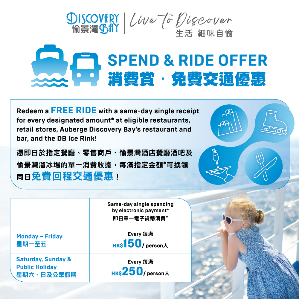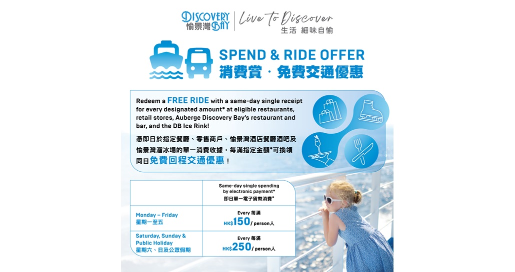 You can redeem a FREE RIDE back to town with a same-day single machine-printed receipt and electronic transaction slip for every designated amount spent at eligible restaurants, retail stores, Auberge Discovery Bay Hong Kong's restaurant and bar, and the DB Ice Rink. The upgraded offer makes it easier for everyone to enjoy the stunning scenery and vibrant lifestyle of Discovery Bay.
