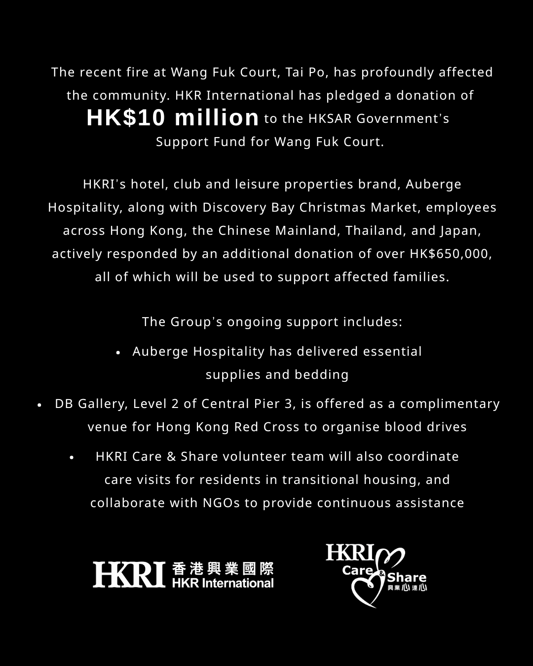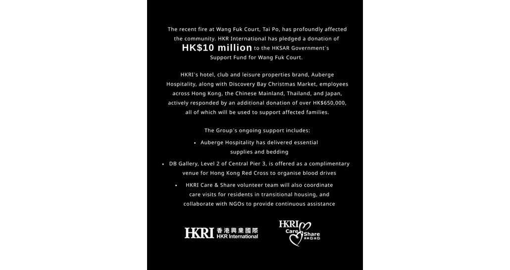 大埔宏福苑火灾对社区造成深远影响,受影响居民面临重大困境。香港兴业国际集团有限公司(「香港兴业国际」)深表悲痛,宣布捐款1,000万港元予香港特区政府成立的「大埔宏福苑援助基金」。此外,香港兴业国际旗下酒店、会所和休闲物业品牌Auberge Hospitality,连同愉景湾圣诞露天市集,以及集团香港、中国内地、泰国及日本员工,均积极响应捐款,额外合共捐赠超过65万港元,悉数用于支援受影响家庭。
