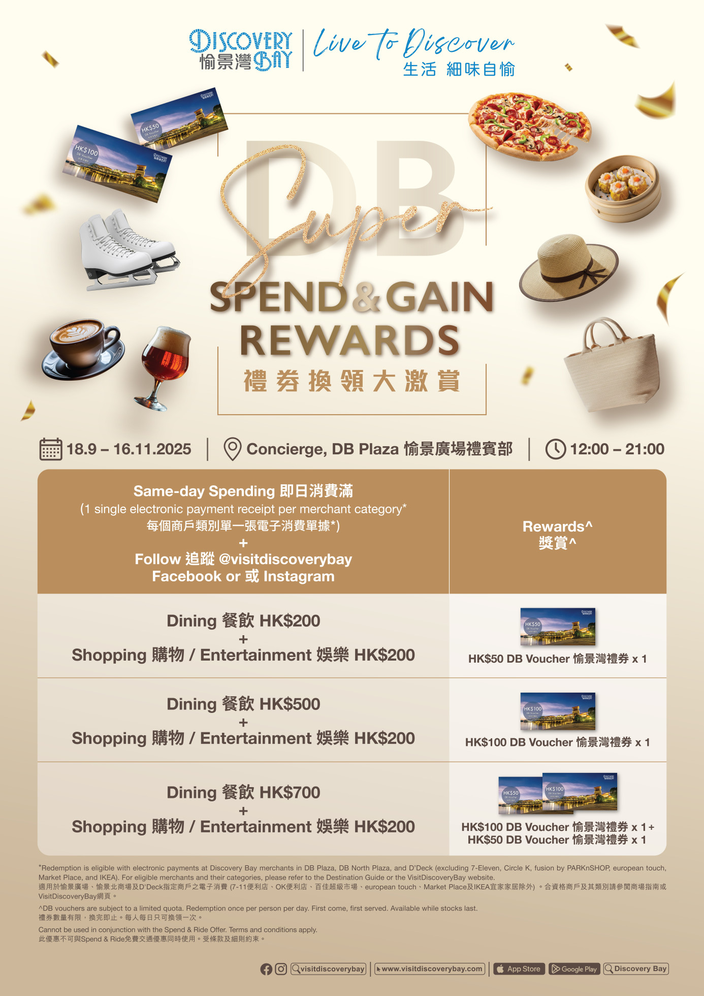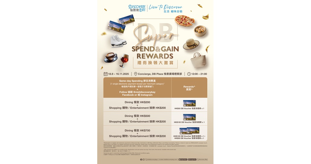即日消费满指定金额 (每个商户类别单一张电子消费单据) 并追踪 @visitdiscoverybay Facebook 或 Instagram |