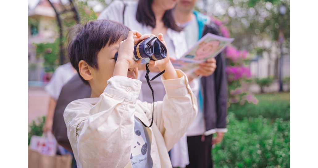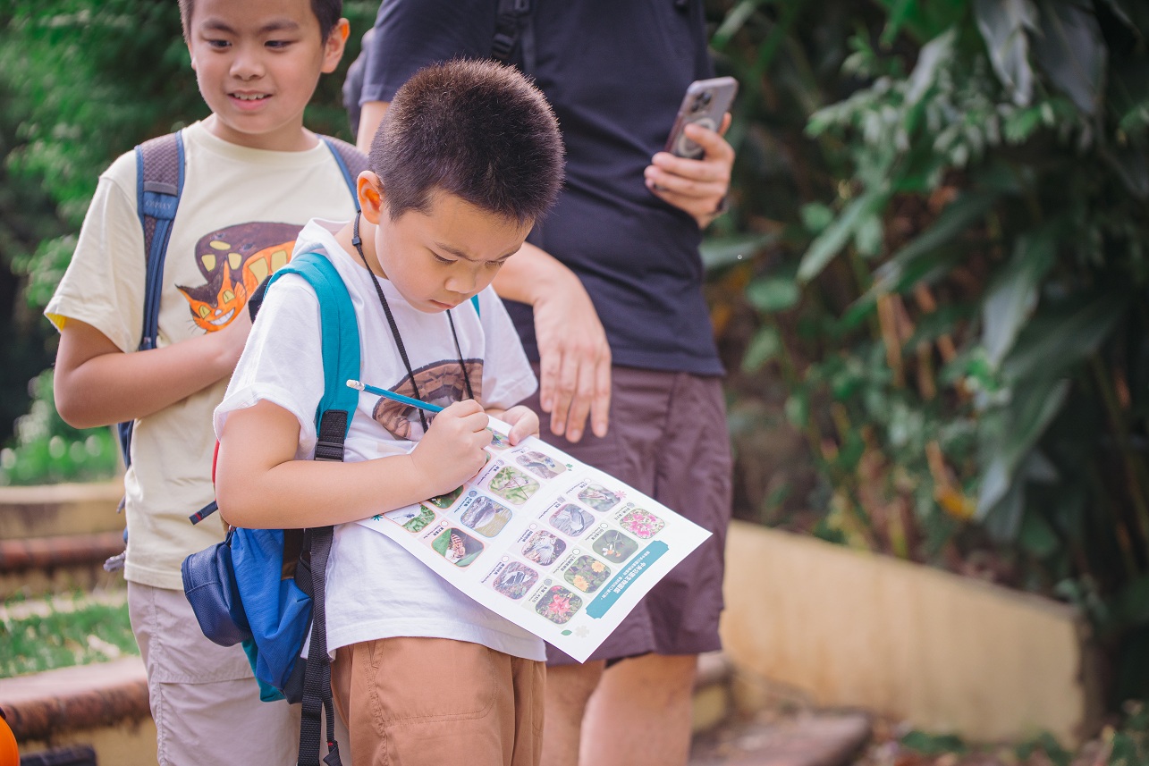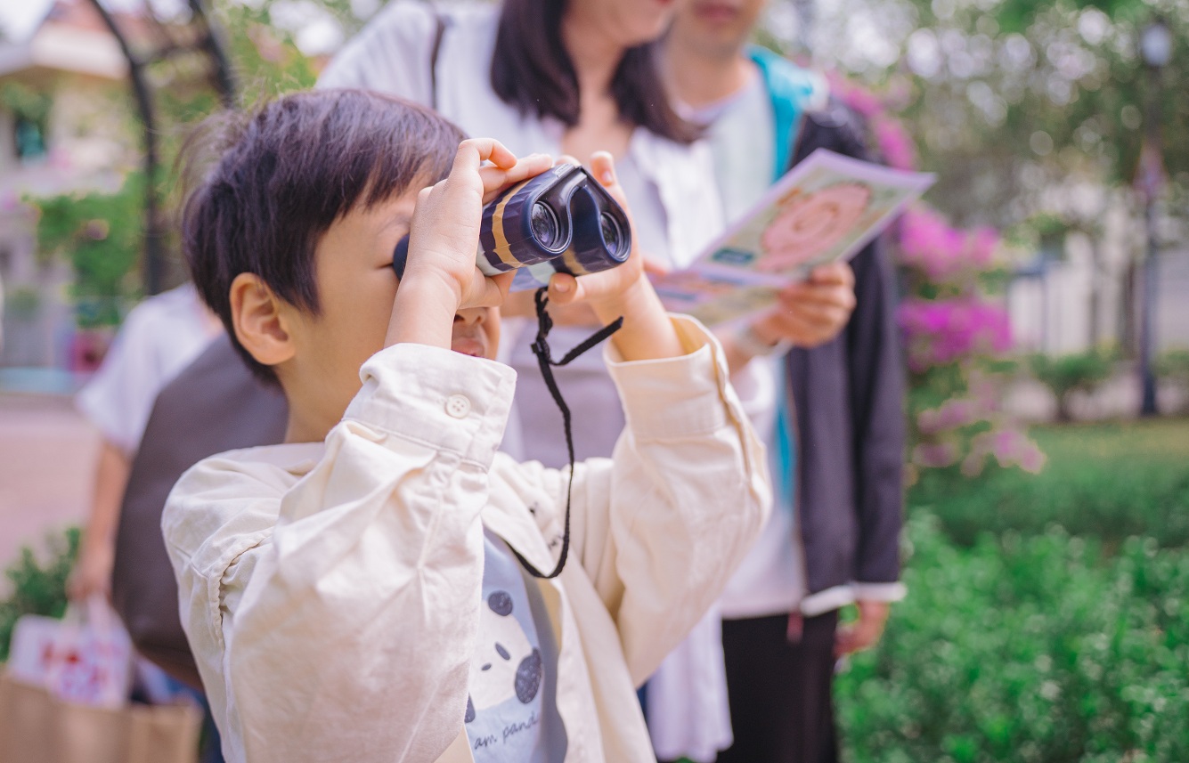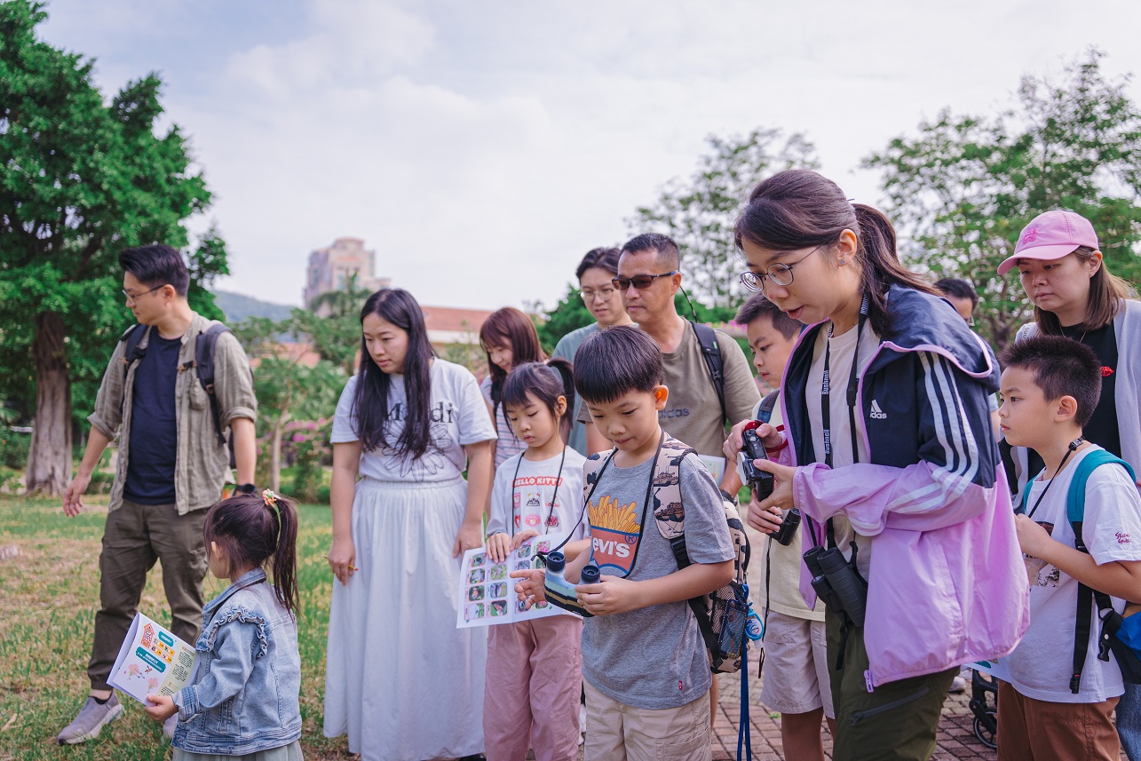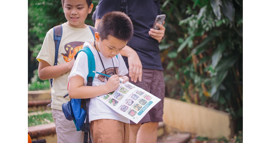 导赏团期间,小朋友在导师的悉心指导下,手持双筒望远镜,仔细寻找藏身于草丛间及池塘里的生态,并观察昆虫及动物的活动,以及植物的生长姿态,完成互动活动册,亲身体验授粉昆虫、植物与万物之间环环相扣的连结。
